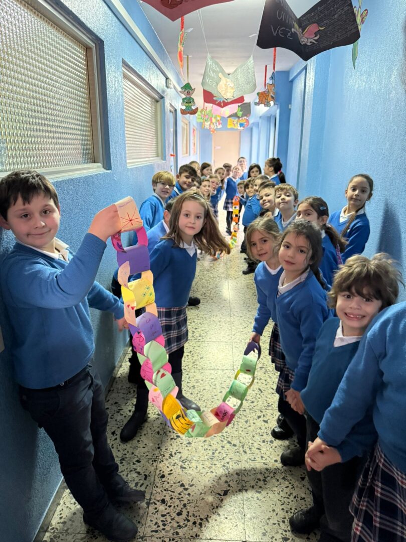 Desde los más pequeños de Infantil hasta los alumnos de Bachillerato, todos han participado en la creación de una gran cadeneta de colores. El objetivo era claro: crear eslabones del mismo tamaño, recordándonos que en la construcción de la armonía social, cada aportación es igual de valiosa y necesaria.
